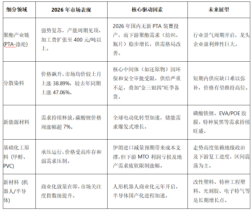 2026年初的行业运行特征表现为“强分化”与“弱复苏”。一方面,上游受地缘政治影响,原油价格震荡加剧。2026年2月,WTI原油一度突破71美元/桶,为化工品提供了成本支撑。另一方面,下游需求呈现“冰火两重天”:与地产、传统基建相关的PVC、甲醇等品种库存高企、价格承压;而与纺织服装、出口及新兴产业相关的聚酯产业链、新材料则展现出强劲的景气度。