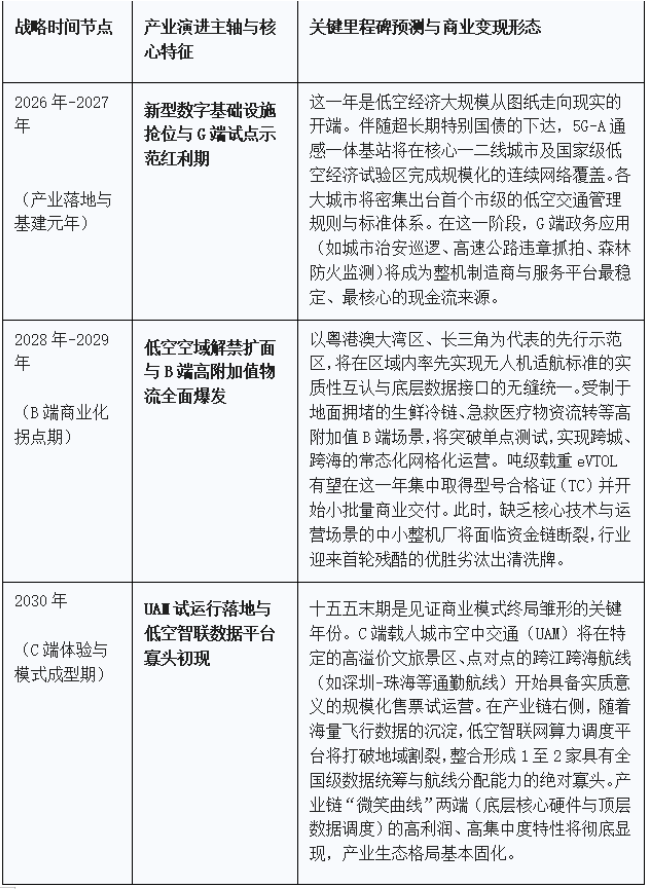 适航发牌与空域解禁推动C端消费市场增长”的严密三段论逻辑。在当前及未来的一到两年内,享有最高且最确定政策红利的环节,是聚焦于低空智联网、通感一体化基站建设的基础设施供应商,以及承接由央国企主导的应急救援、城市综合治理、电力巡检等G端特许采购项目的生态企业。随着基础设施密度的提升与适航认证的规模化落地,政策红利将迅速向B端的大规模物流运输溢价,并最终在“十五五”中后期实现向C端城市空中交通(UAM)场景的历史性跨越。