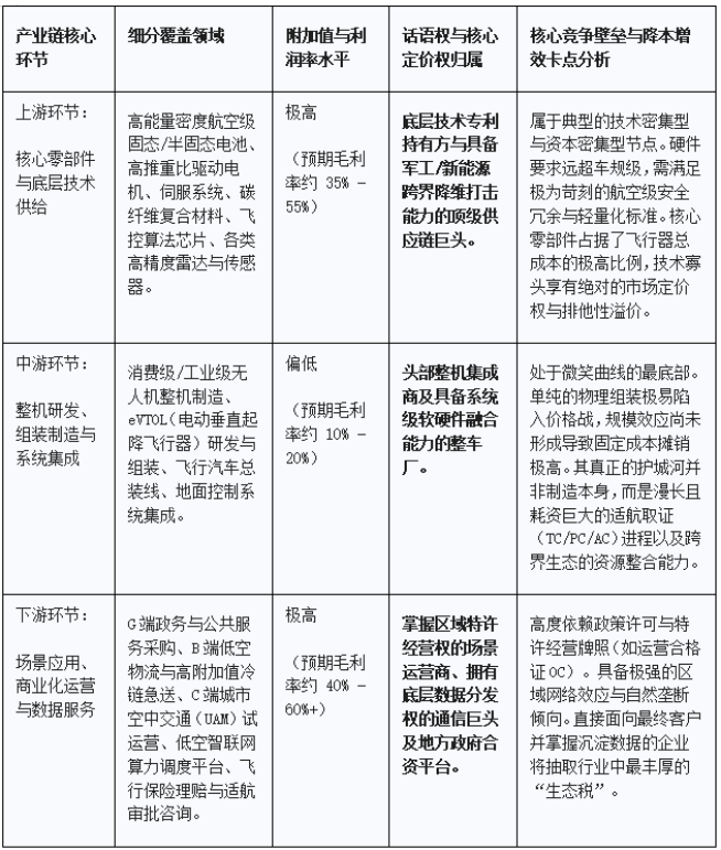 为了直观呈现低空经济产业链的价值分布,我们运用微笑曲线模型对上、中、下游核心环节进行了结构化剖析,揭示各环节的竞争逻辑与利润空间。