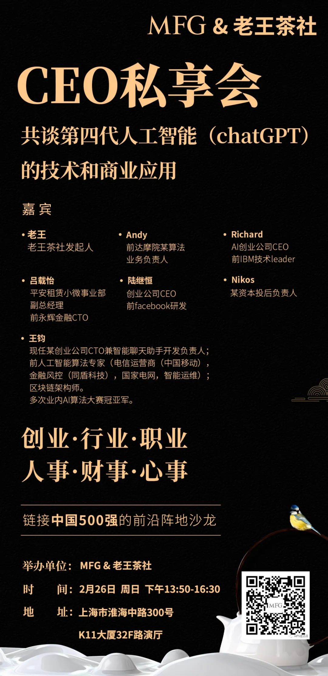 本期CEO私享会,MFG特别联合了上海“最专业”的中国500强职场民间沙龙“老王茶社”,邀请到曾供职于阿里集团达摩院、IBM、平安集团、Facebook、中国移动……一众人工智能领域顶级企业的技术大咖,以及知名投资机构专家和行业资深人士,带来一站式、全方位的ChatGPT与人工智能解读。