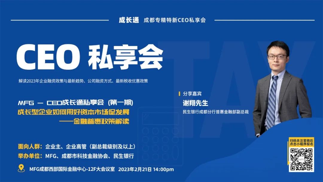 在此之前,MFG已连续在北京、上海、深圳、成都等地联合政府主管部门、行业协会、专家学者和名企高管,举办数十场面向成长型企业创始人、企业高管的高端私享沙龙,囊括金融普惠政策、企业经营管理和行业投资风向等话题,获得热烈反响。