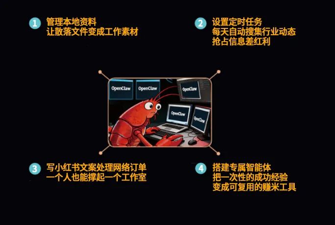 比如副业增收。你想搞点副业,但没时间、没技术。龙虾帮你跑通一些简单的流程,让你不用从零开始。