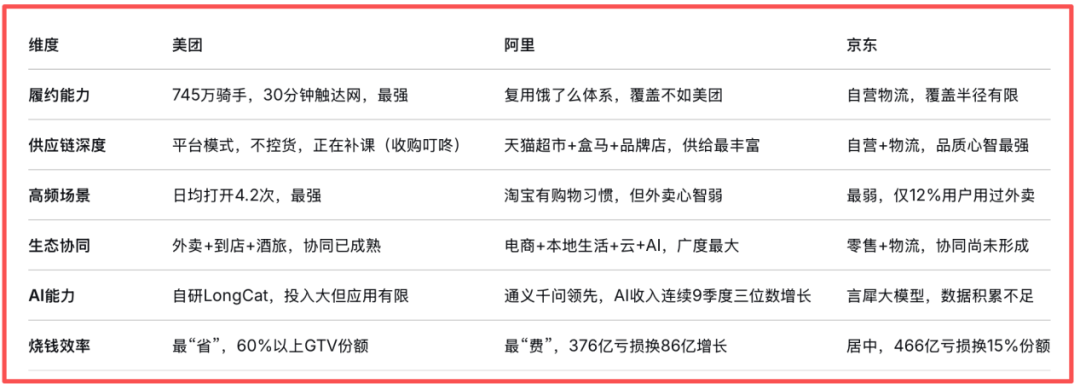 美团的底牌是履约,阿里的底牌是生态,京东的底牌是供应链。三张底牌,三条活路,但都绕不开同一个字——熬。