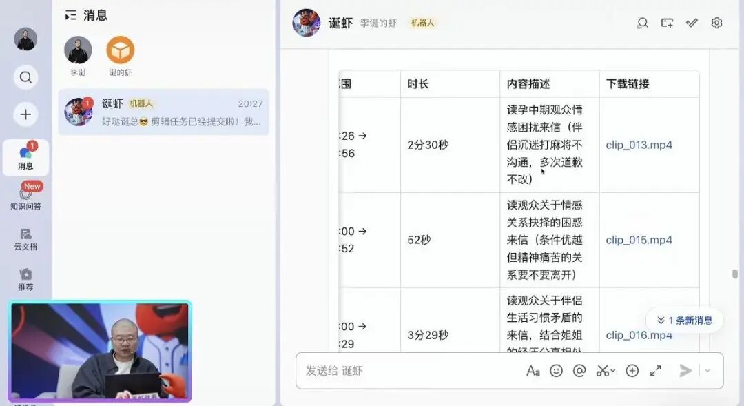 李诞那边养的虾是另一个用法。他在直播里展示了自己的"诞虾"——帮他剪直播切片,帮他生成播客,帮他在微博上生成视频还能发布内容。全程没有代码,没有技术界面,就是正常地说你要什么,它去做。