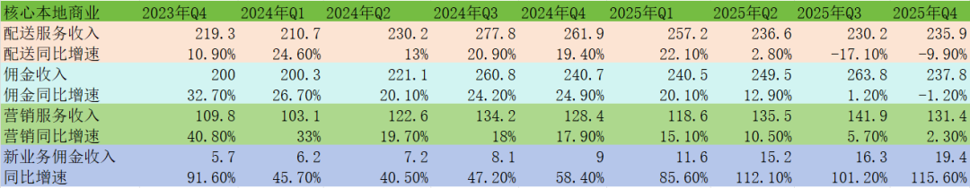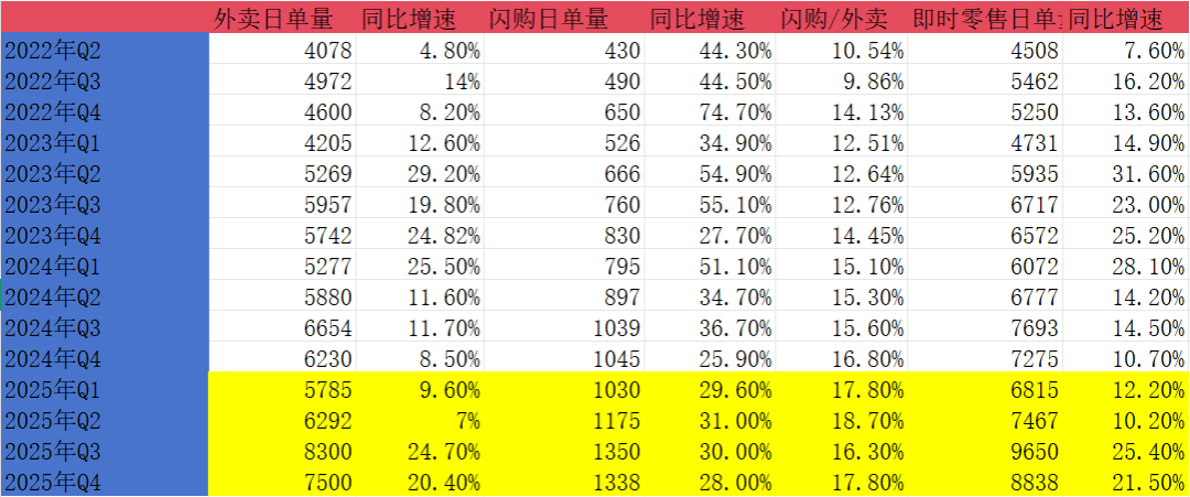 1.美团到右侧了,在《2025年Q4美团业绩前瞻》中,我们曾说美团已见底,但反转时刻未到,四季报出来后,结合管理层释放的信息,我们认为美团右侧已到,反转时刻来了。不过,这次的反转与2024年2月后那一轮有所不同,会相对比较温和,原因有多个方面:首先,这次的反转是业绩反转预期驱动的估值修复,最乐观的情况下,核心本地商业二季度有望实现扭亏为盈,50%左右概率,即便二季度没有盈亏平衡,亏损也将大幅降低到20亿左右,核心变量是阿里是否在二季度降补。而2024年那一轮,中概股整体估值都被压到了极低,在那之后,港股经历了一轮相当强劲的估值+业绩双轮驱动牛市。所以,2024年那一轮美团股价大涨,是业绩反转+港股整体估值提升的戴维斯双击。其次,互联网逐渐登化,大科技公司的整体估值不再像过去那么性感。不论是美股七姐妹,还是中概互联网巨头,大家彼此彼此。另外,美团这一轮股价回落,核心原因是到家业务竞争格局恶化,目前我们能看到的趋势,是行业竞争将逐渐走向理性,美团大概率惨胜收场,然后逐渐修复利润,但后续竞争强度仍比淘宝闪购、京东介入前激烈。2.美团四季报基础数据整体温和,况且2月初美团已发布了一份业绩预告。四季度核心本地商业经营亏损100.5亿,到店酒旅(含交通票务民宿)季度利润预计48亿左右,即时零售(外卖+闪购)季度亏损约148亿,单均亏损约1.8元,环比三季度单均减亏0.4元。粗略预计,一季度即时零售的单均亏损可以做到1.2元左右,季度亏损约85亿,同时到店酒旅季度盈利预计40亿左右,核心本地商业整体亏损可能改善到45亿左右。二季度的两个大的变量:补贴力度调整和即时零售UE自然改善(二季度季节性好)。UE因季节性自然改善是高度确定的,所以核心变量只有一个,二季度阿里是否降补。假设阿里不调整补贴力度,美团即时零售二季度UE环比预计改善0.3元左右,也就是单均亏损改善到约0.9元,毛估估即时零售亏损68亿左右,核心本地商业总体亏损20亿左右。假设阿里二季度进一步降补,美团UE环比可能改善0.5-0.8元(视阿里降补力度),意味着单均亏损将下降到0.4-0.7元,核心本地商业届时将扭亏为盈。2025年Q3出现了221亿的经营性现金流出,而四季度是66亿,环比改善了155亿,经营性现金流大幅改善是一个积极的信号。四季度美团流动资产2251亿,流动负债1235亿,流动比率1.82,速动比率1.55,环比三季度均大幅改善。对于上市公司来说,最具说服力的数据其实不是营收、利润,而是现金流和资产负债表。季度总体收入921亿,同比增长4.1%;其中核心本地商业营收648亿,同比下降1.1%,;新业务273亿,同比增长18.9%,比预期中好。整体来说核心本地商业有改善,但中规中矩,新业务比较优秀。本季度毛利率仍然维持低位,较上季度小幅回升0.2个pct,考虑到Keeta新进入四个国家,额外增加了20多亿前置支出,即时零售的毛利率改善显著高于0.2个pct。研发和行政开支的营收占比相较于三季度小幅攀升,有压力但还算正常;营销开支占比下降1.5个百分点,同样考虑到Keeta的额外投入,即时零售的营销开支比重环比下降实际上更多。季度EBITA利润-151亿,环比改善9亿,若剔除Keeta额外增加的20多亿前置支出,环比修复35亿左右。分业务来看,核心本地商业季度亏损100.5亿,预期之内,环比改善40亿,到店酒旅环比利润增加可能在7-10亿,即时零售的利润修复在35亿左右。新业务季度亏损46.5亿,主要受Keeta四季度新进了海湾三国和巴西影响,有20多亿的一次性额外前置投入。季度经营性现金流-66亿,环比大幅改善,一季度是经营性现金流淡季,预计仍然为负,二季度无论核心本地商业能否盈利,公司整体的经营性现金流大概率回正。核心本地商业季度配送收入236亿,环比增长2.5%、同比下降9.9%;佣金收入238亿,同比下降1.2%,环比下降9.9%;营销服务收入131.4亿,同比增长2.3%。从核心本地商业三项收入表现来看,边际有改善,整体仍在低位。新业务佣金收入增长115.6%,加速增长反应Keeta强势进展。四季度外卖日均单量大约7500万,闪购日均单量大约1338万,即时零售日均单量大约8838万,单均亏损1.82元左右,到店酒旅GTV大约3150亿,货币化率大约6%,经营利润率大约25.5%。四季度美团闪购在非餐即时零售的市占率大约60%(不含小象、盒马等1P业务),双方即时零售UE差距大约1.7元,其中美团大约-1.8,淘宝闪购大约-3.5。