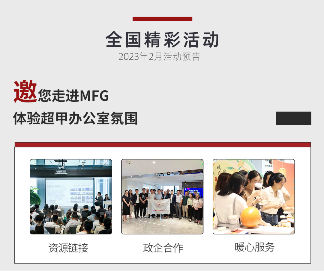 春回华夏、万物生长。立足当下,我们获得过的幸运与荣光,也对抗过磨难与阻碍, 放眼未来,我们满怀憧憬去拓展更加广阔的天地。2023年 MFG将不断提升服务式办公品质,提升资源与商机的链接能力,与您相伴美好办公,共赴每一个灿烂朝夕!