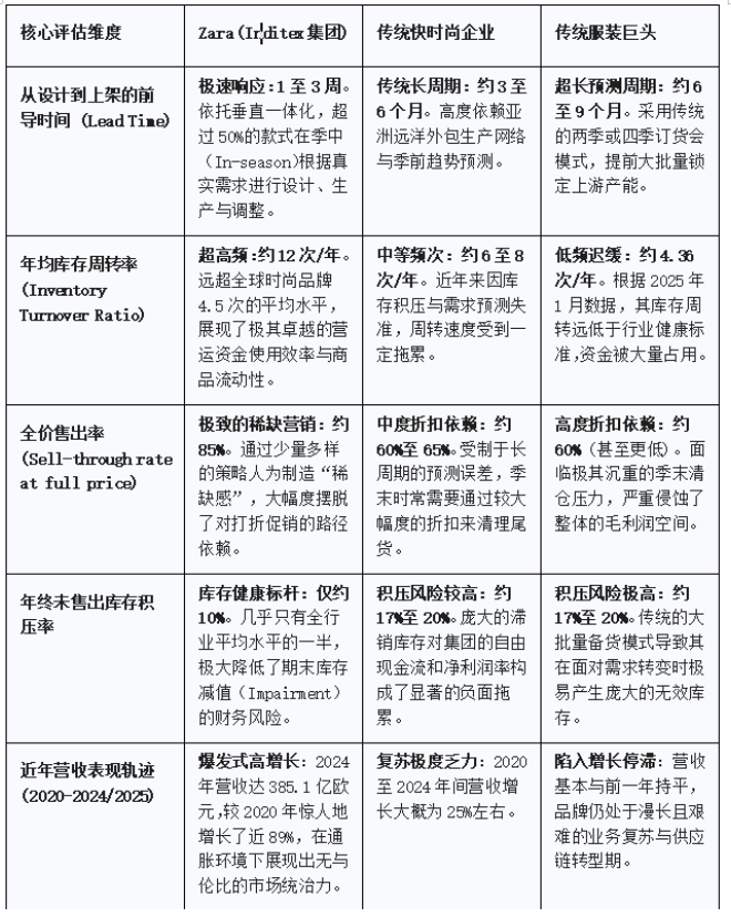在深入剖析Zara底层复杂的供应链运作机制之前,必须首先通过严谨的商业数据,直观地量化其供应链“敏捷性”所转化出的巨大财务与市场优势。这种比较不仅揭示了不同企业在应对市场波动时的韧性差异,更从根本上验证了不同供应链战略的优劣。本节选取了Inditex集团(以Zara为主导)、以H&M为代表的传统快时尚巨头,以及以Gap为代表的传统北美服装巨头,在若干决定生死存亡的核心维度上进行全景式的数据比对。