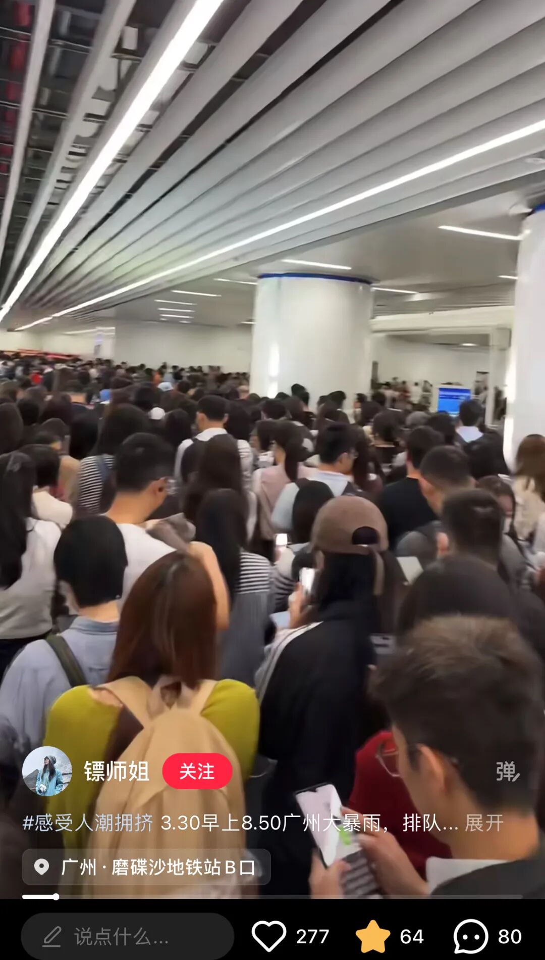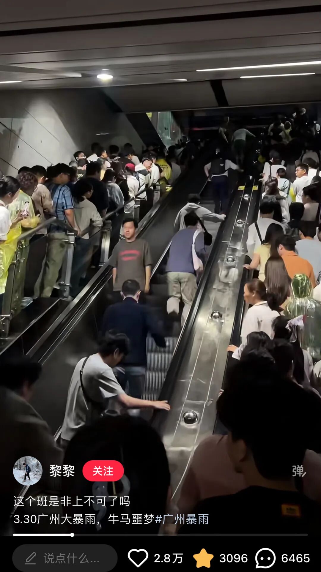 前几天,广州暴雨,地铁站里挤满了上班早高峰的打工人。
