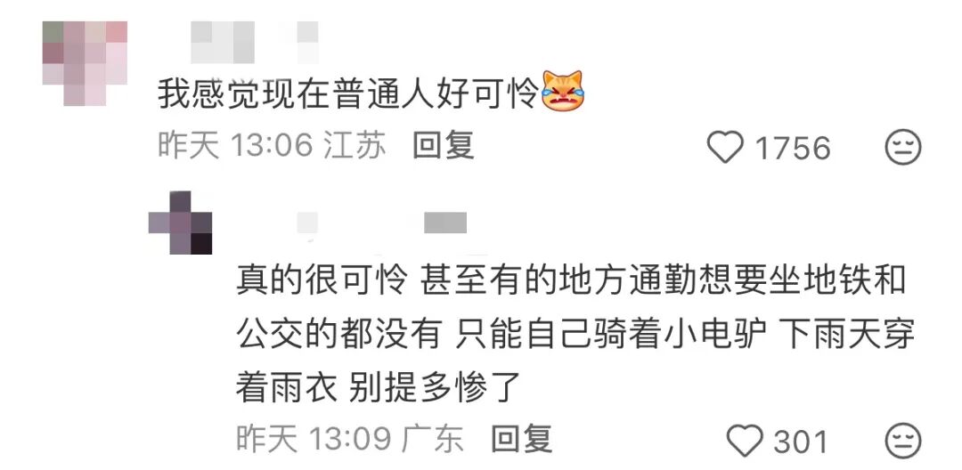 “我感觉现在普通人好可怜。有的地方甚至连地铁都没有,只能下雨天骑着小电驴,别提多惨了。”