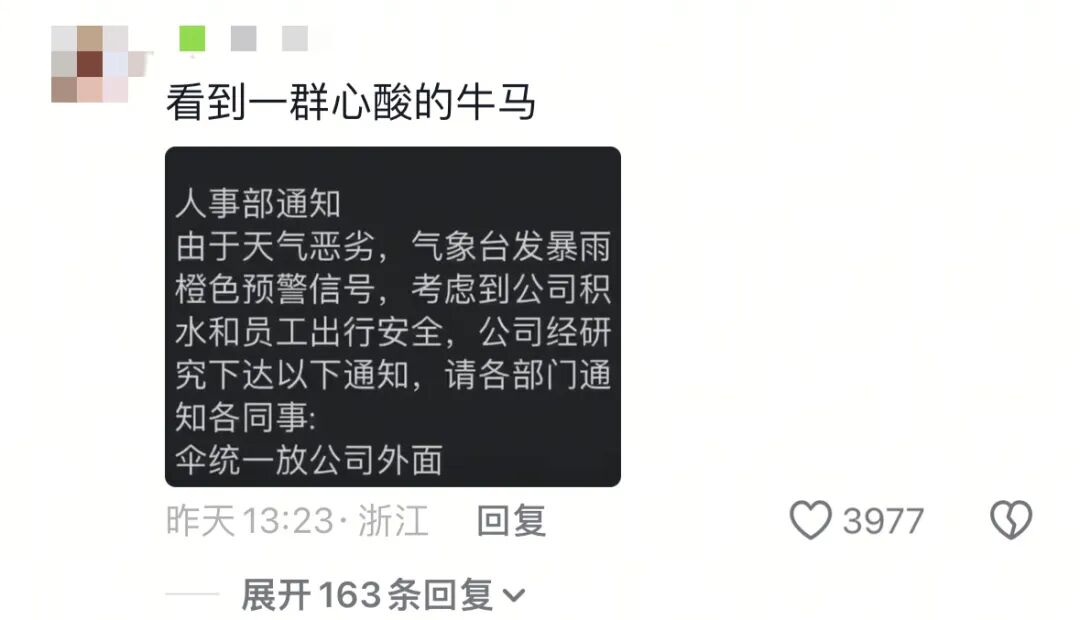 “由于天气恶劣,考虑到公司积水和员工出行安全,公司经研究下达以下通知: