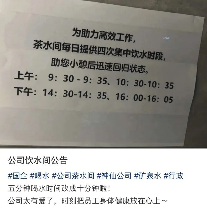 也就是说,员工一天内只能在这几个时间段里集中去茶水间喝水,其他时间只能渴着。