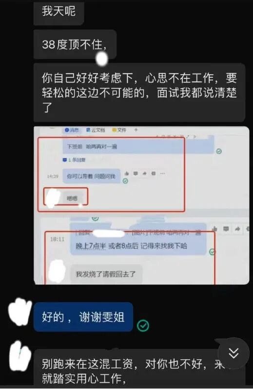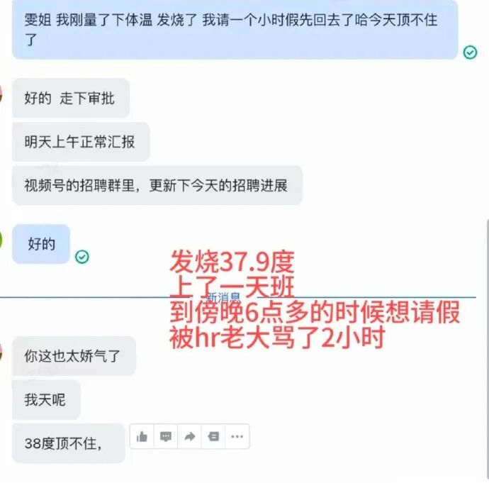 比如,有员工发烧了还是坚持上班,到傍晚6点多实在撑不住了,就和hr负责人请假1个小时。