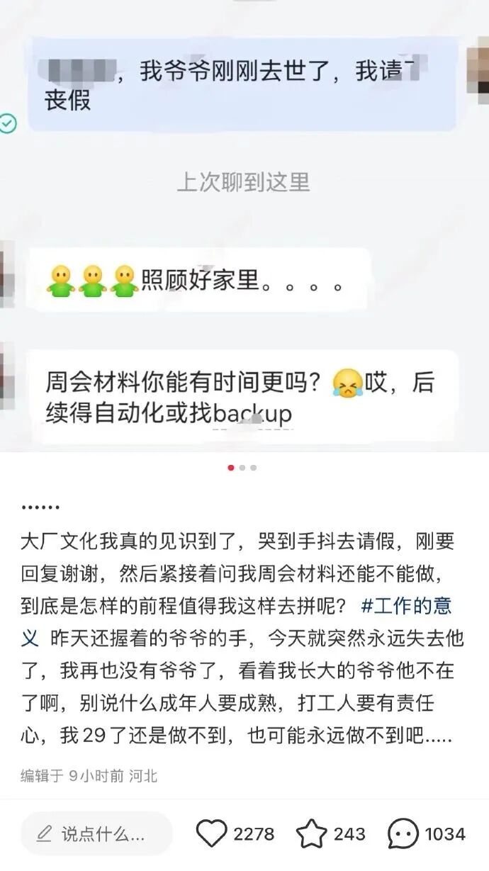 还比如,有员工因爷爷去世,哭到手抖去请了丧假。