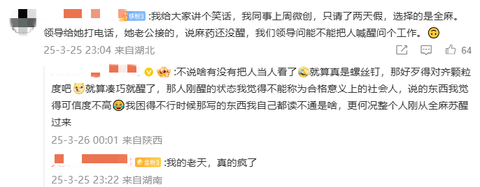 有人去做微创手术,选择的是全麻,领导给她打电话,她老公接的,说麻药还没醒,结果领导问能不能把人喊醒问个工作。