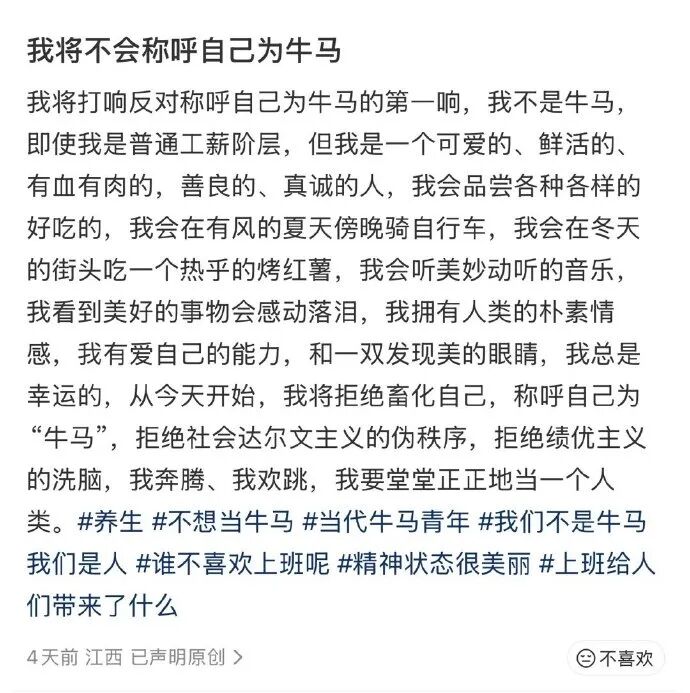 从今天开始,我将拒绝畜化自己,称呼自己为‘牛马’,拒绝社会达尔文主义的伪秩序,拒绝优绩主义的洗脑。