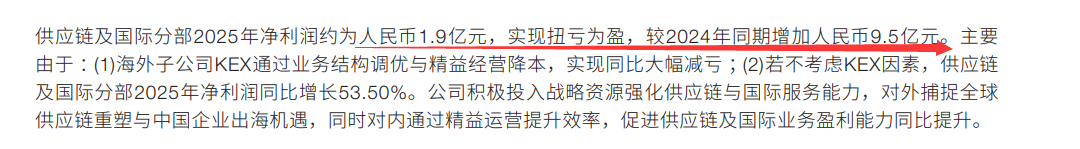 2021年,顺丰设立“供应链及国际业务”板块,其在2022年为公司贡献了34%的收入、28%的净利润。但过去两年,受国际物流环境持续变化的影响,这块业务也一直处于亏损状态, 2025年才扭亏为盈,实现营业收入729.4亿元,同比增长3.5%。
