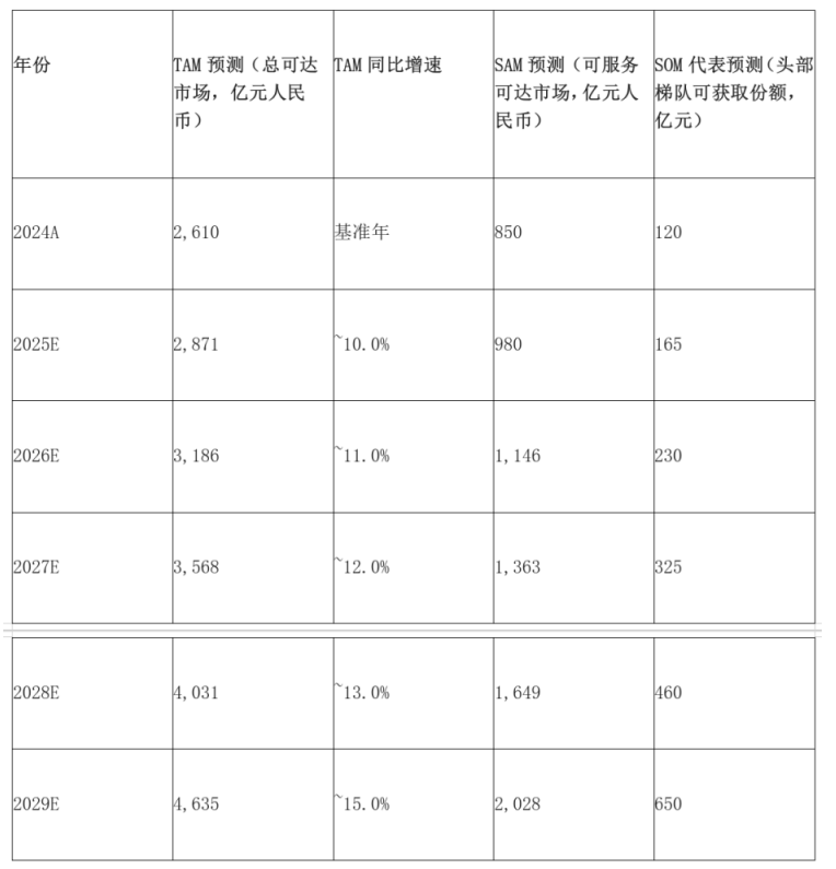 在测算逻辑上,我们放弃了简单的线性外推法,而是将市场细分为总可达市场(TAM)、可服务可达市场(SAM)与可获得市场(SOM)三个层级,并为每个层级设定了严密的渗透率与转化率假设。
