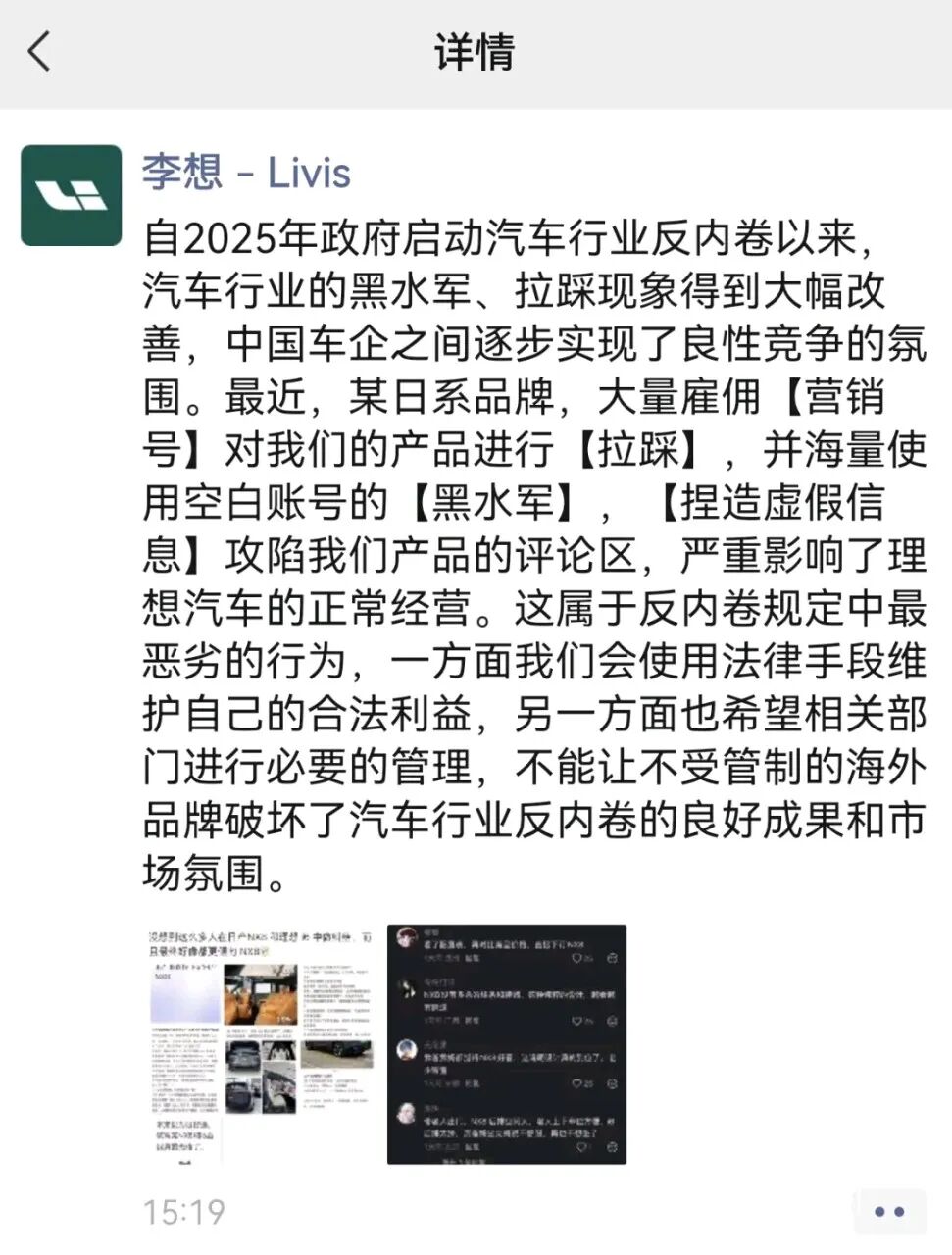 李想随后一条朋友圈直接曝出他的所指,明确某日系品牌大量雇佣黑水军对理想拉踩抹黑,并晒出了东风日产的截图。很显然,李想所指就是这家日系车企。