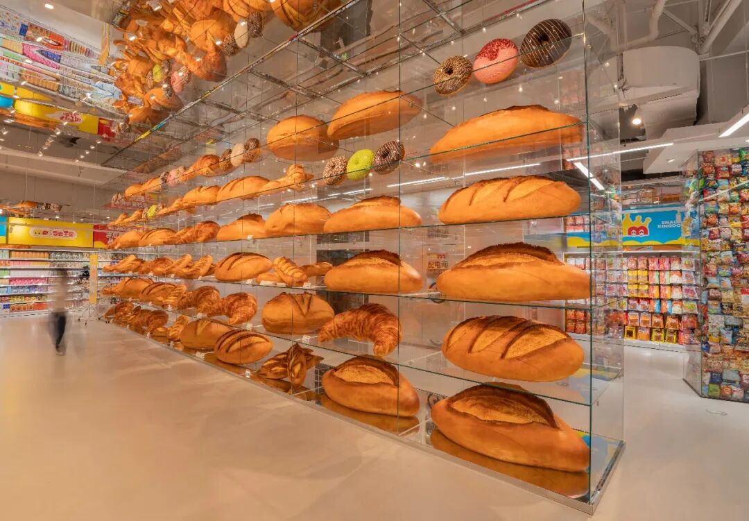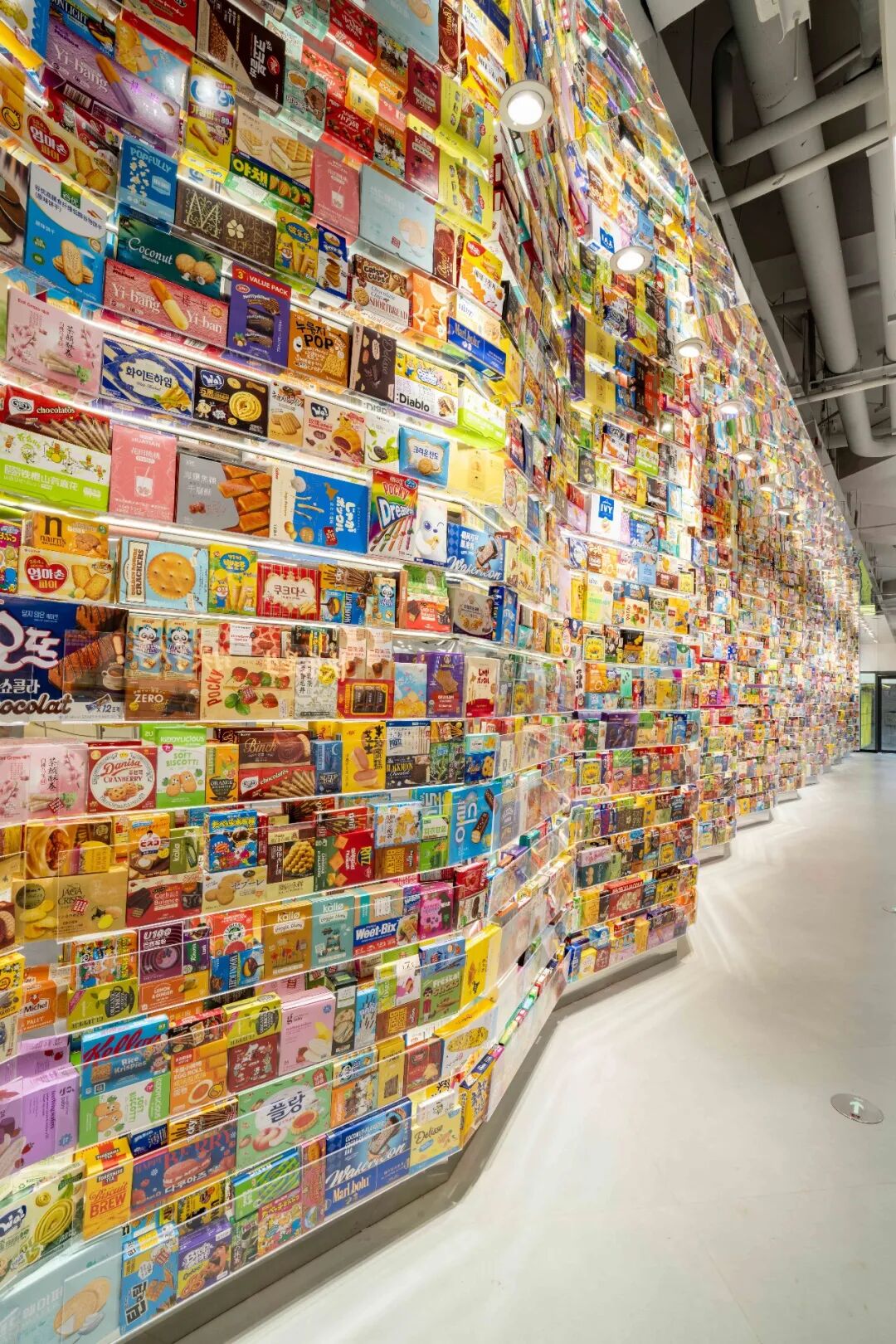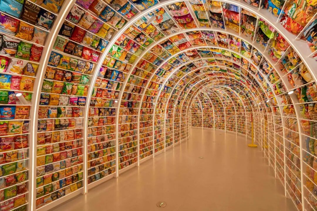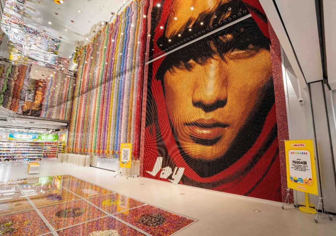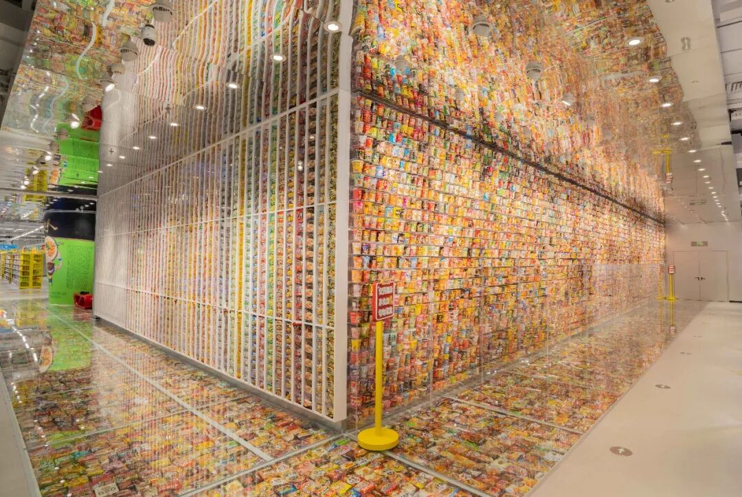 门店入口处的“零食长廊”率先开启快乐模式,两侧墙面用真实的膨化食品包装拼贴而成,走进长廊,仿佛瞬间从日常场景切换到“零食世界”,完成“新奇—好玩—放松”的情绪转换。而店内的标志性打卡点,更是让人眼前一亮:由7万+颗棒棒糖拼制的巨幅周杰伦《范特西》封面墙,耗费30名工人72小时拼接完成,既是80、90后的青春记忆,也是00、10后的潮流打卡地;2.7米高的巨型购物车装置,满载笑脸黄色快乐圆球,传递“贩卖快乐”的理念,消费者可以走进购物车内部拍照,体验“被零食包围”的幸福感;还有60+零食IP乐园,MM豆、盼盼、好丽友、旺旺、康师傅等知名品牌的IP形象齐聚一堂,消费者可以与喜欢的IP角色零距离互动、合影,沉浸式感受快乐氛围。