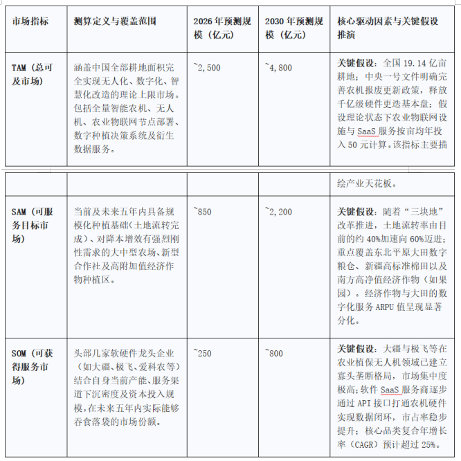 核心驱动因素深度解析:其一,硬件渗透率的非线性跨越。以农业无人机这一核心载体为例,行业预测到2029年全球市场空间将达248亿元,增量规模超过190亿元。中国市场在国家购机补贴政策与地方金融租赁杠杆的双重刺激下,将迅速迎来从“早期技术采用者”向“早期大众市场”的非线性跨越,硬件的规模化部署将成为做大SOM的基本盘。 其二,软硬件解耦与服务化转型(XaaS化)。市场增量的长期核心驱动力将逐渐从一次性的硬件资本性支出(CAPEX)转移到持续性的运营性支出(OPEX),即按年或按产季支付的农田数字化管理与订阅费用。参考美国农业巨头拜耳旗下The Climate Corporation在美国服务超30%农场的成熟商业模式,中国本土基于数据驱动的智慧决策服务渗透潜力巨大,将带来持续产生复利的增量市场。