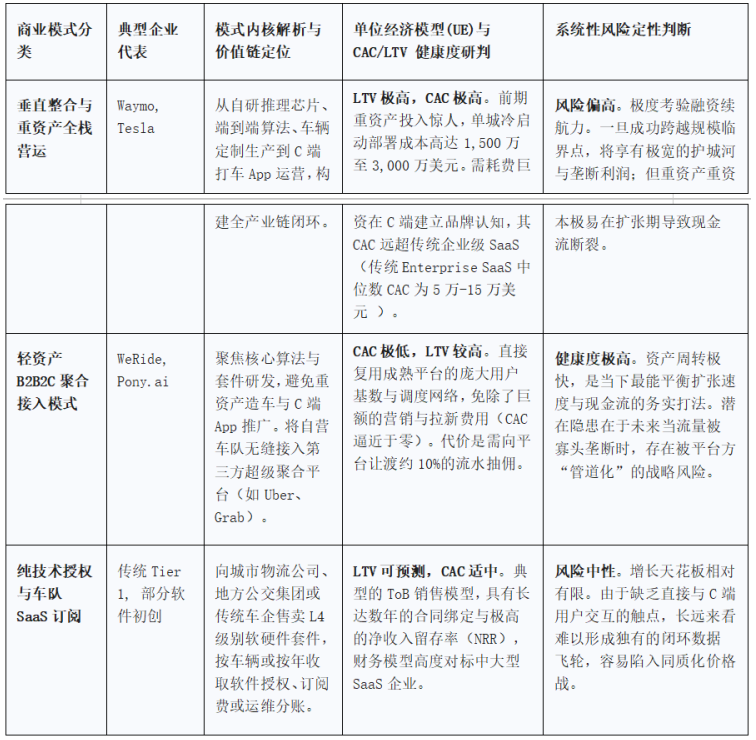 第一,重构资产结构,卡位“物理AI”与“轻资产运营”的双极竞争格局。重资产整车制造企业必须向垂直整合的“物理AI”平台转型,以彻底掌控底层硬件BOM成本;而AI初创企业应坚决采取“轻资产+B2B2C”战略,通过深度捆绑头部超级出行聚合平台,将极高的C端获客成本(CAC)降至极低区间,换取区域市场的快速击穿。