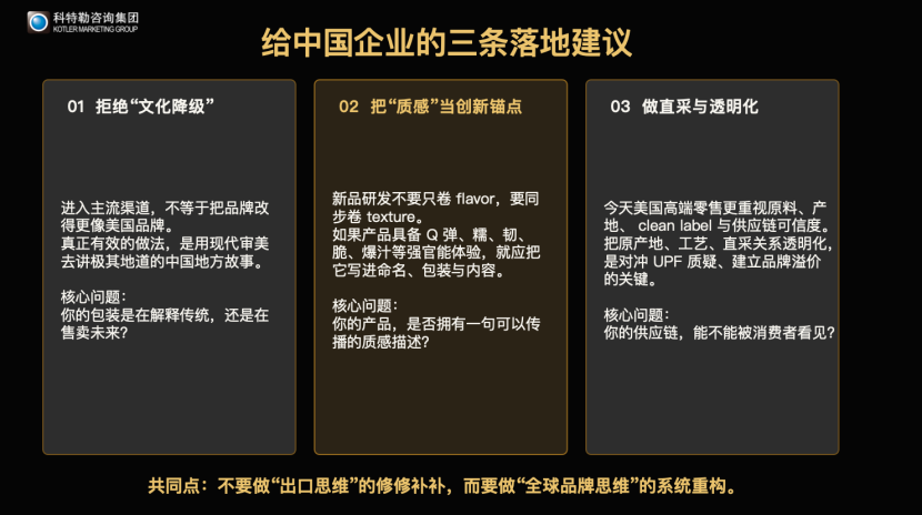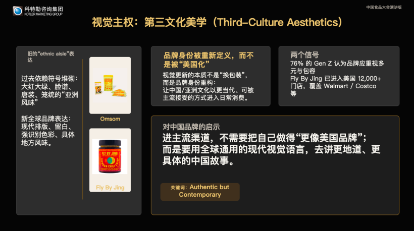 拒绝文化降级:不要伪装成美国品牌,而要用全球现代视觉语言,真诚、具体地表达中国身份(如四川、宁波、河南胡辣汤),实现“认知增值”。
