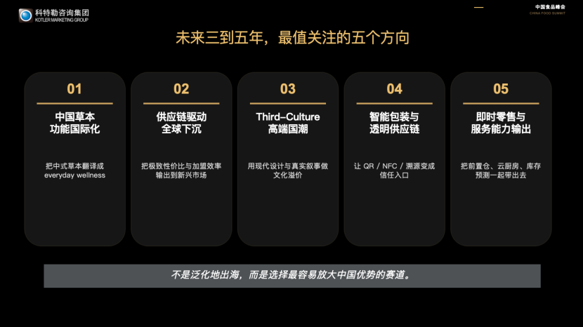 4月15日,科特勒咨询集团KMG全球合伙人曹虎博士出席“2026全球食品饮料创新博览会”并发表演讲,主题为“中国食品企业全球化战略的范式转移”。在演讲中,曹虎鲜明地提出了“中国食品出海的新思维”,核心在于从传统的“低价出口”模式转向以文化自信、产品质感和本地化运营为核心的“重塑全球消费者对中国食物的全新认知”。