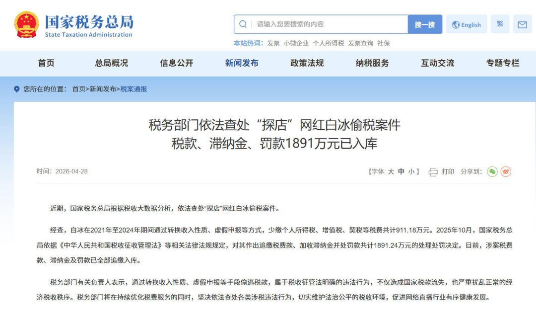 又一个千万级网红栽了,这次的主角叫白冰,偷逃税款911.18万元,追缴加罚款共计1891.24万元。