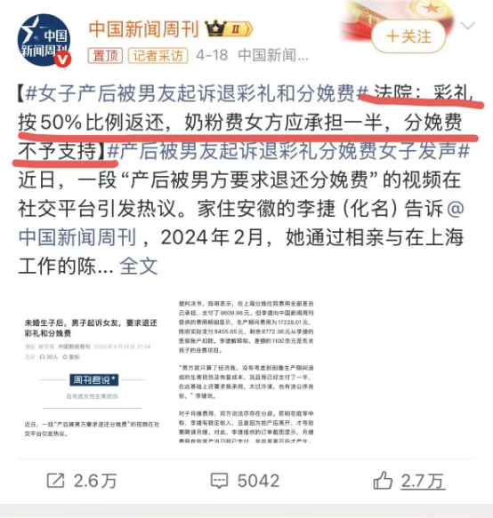 而且法院最后判定的结果是,彩礼退还50%,奶粉费女方承担一半,但男方要求退还的分娩费不予支持。