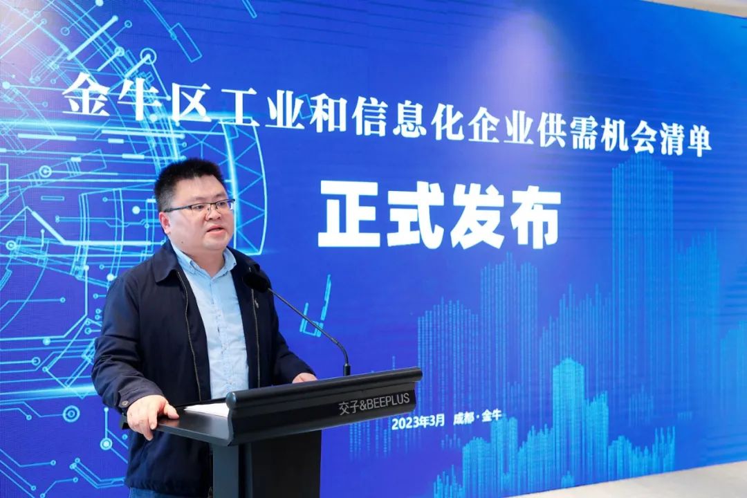 由金牛区经济和信息化局牵头举办的金牛产业会客厅——“智慧金牛”企业供需交流会在成都交子&BEEPLUS中心成功举行。金牛区副区长、高新园区党工委书记徐苒鑫、金牛区经济和信息化局局长陈友谊等领导出席活动。现场三张供需清单正式发布,金牛区为企业提供更及时的对接、更高效的服务、更精准的供给。