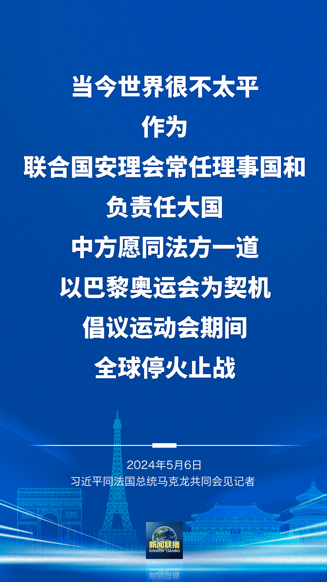 当地时间5月6日下午,国家主席习近平在巴黎爱丽舍宫同法国总统马克龙会谈后共同会见记者。习近平指出,很高兴应马克龙总统邀请,在中法建交60周年之际,再次对法国进行国事访问。我同马克龙总统举行了富有成果的会谈。我们一致认为,中法关系具有珍贵历史、独特价值和重要使命,双方要传好历史的接力棒,弘扬中法建交精神并为其赋予新的时代内涵,开启中法关系下一个60年的新征程。一是巩固双边关系战略稳定。我欢迎马克龙总统再度访华。中法双方重申相互尊重彼此核心利益,将用好两国多层次、多维度交流渠道,及时沟通和协调政策立场。二是挖掘互利合作广阔潜力。双方将促进双边贸易向上平衡,扩大农食、金融等领域合作,推进航空航天、民用核能等领域联合研发和创新,加强发展战略对接,拓展绿色能源、智能制造、生物医药、人工智能、第三方市场等新兴领域合作。中方已经实现制造业准入全面放开,将加快开放电信、医疗等服务业市场准入。我们鼓励扩大双向投资,致力于为对方国家企业提供良好营商环境。此访期间,双方签署18项部门间合作协议,涵盖航空、农业、人文、绿色发展、中小企业合作等领域。三是加快人文交流“双向奔赴”。以中法文化旅游年为契机,推进教育、体育、影视、青年、地方等合作。中国支持法国办好巴黎奥运会,欢迎更多法国朋友赴华,决定将对法国等12国公民短期来华的免签政策延长至2025年年底,支持增开上海至马赛直飞航线。150年前法国人士参与建设的中国福建船政学堂、上世纪初的赴法勤工俭学运动都是两国教育交流史上的佳话。我们欢迎法国担任今年中国国际教育年会主宾国,推动未来3年法国来华留学生突破1万人、欧洲青少年来华交流规模翻一番。四是凝聚全球合作更大共识。双方将深化在气候变化、生物多样性等领域合作,加强在人工智能全球治理、国际金融体系改革等领域对话。中方支持法方办好2025年联合国海洋大会,鼓励两国国家公园和自然保护区结对。习近平指出,当今世界很不太平。作为联合国安理会常任理事国和负责任大国,中方愿同法方一道,以巴黎奥运会为契机,倡议运动会期间全球停火止战。关于巴以冲突,这场悲剧延宕至今,是对人类良知的考验,国际社会必须有所作为。我们呼吁推动加沙立即实现全面、可持续停火,支持巴勒斯坦成为联合国正式会员国,支持恢复巴勒斯坦民族合法权利,重启“两国方案”,实现中东地区持久和平。关于乌克兰危机,中方已经多次阐明立场。中国既不是危机的制造者,也不是当事方、参与方,但我们没有隔岸观火,而是一直在为实现和平发挥积极作用。中国政府欧亚事务特别代表已经开启第三轮穿梭斡旋。同时,我们反对利用乌克兰危机甩锅、抹黑第三国,煽动“新冷战”。历史反复证明,任何冲突最终只能通过谈判解决。我们呼吁各方重启接触对话,逐步积累互信;支持适时召开俄乌双方认可、各方平等参与、公平讨论所有和平方案的国际和会;支持构建均衡、有效、可持续的欧洲安全框架。习近平指出,今年是新中国成立75周年,经过75年艰苦卓绝的奋斗,中国的国家面貌和人民生活发生了翻天覆地的变化,但有一点从未改变,那就是我们和平良善的本性、博大包容的胸襟和对公平正义的追求。它根植于5000多年的中华文明,生长于中国人民的灵魂深处。中国愿同包括法国在内的世界各国一道,在相互尊重的基础上发展友好合作关系,携手前行、共担风雨、共创未来。