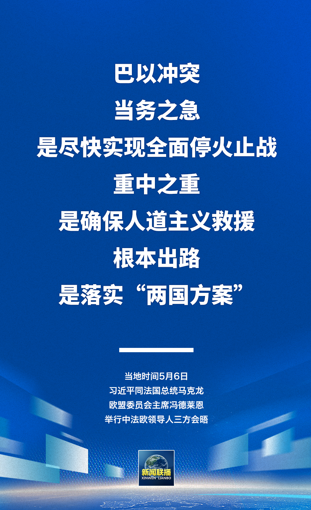当地时间5月6日上午,国家主席习近平应邀在巴黎爱丽舍宫同法国总统马克龙、欧盟委员会主席冯德莱恩举行中法欧领导人三方会晤。习近平指出,中国始终从战略高度和长远角度看待中欧关系,将欧洲作为中国特色大国外交的重要方向和实现中国式现代化的重要伙伴,希望中法关系、中欧关系相互促进、共同发展。当今世界进入新的动荡变革期,中欧作为两支重要力量,应该坚持伙伴定位,坚持对话合作,深化战略沟通,增进战略互信,凝聚战略共识,开展战略协作,推动中欧关系稳定健康发展,为世界和平和发展不断作出新的贡献。习近平强调,中欧关系有着强大内生动力和广阔发展前景,不针对、不依附、也不受制于第三方。希望欧盟机构树立正确对华认知,制定积极对华政策。双方要尊重彼此核心利益和重大关切,维护中欧关系政治基础和国际关系基本准则。双方要筹办好新一次中欧领导人会晤以及战略、经贸、绿色、数字高层对话,打造稳定互信的产业链供应链伙伴关系。用好中国对欧洲国家免签政策和外籍人员来华便利安排,鼓励民间和地方交往、教育和科研合作,改善中欧关系的民意基础和舆论氛围。习近平指出,中国新能源产业在开放竞争中练就了真本事,代表的是先进产能,不仅丰富了全球供给,缓解了全球通胀压力,也为全球应对气候变化和绿色转型作出巨大贡献。不论是从比较优势还是全球市场需求角度看,都不存在所谓“中国产能过剩问题”。中欧合作的本质是优势互补、互利共赢,双方在绿色和数字转型中有着广泛共同利益和巨大合作空间,双方应该通过对话协商妥善处理经贸摩擦,照顾双方合理关切。马克龙表示,今年是法中建交60周年,法中合作取得许多重要成果。很高兴在习近平主席对法国进行第三次国事访问期间举行法中欧领导人三方会晤。这既是以往几次法中欧领导人三方会晤的延续,也是应对各种国际挑战的紧迫需要。当前世界面临重大挑战,国际局势处于关键转折点,法国和欧盟比以往任何时候都更加需要同中国加强合作,这事关欧洲的未来。法方希望同中方加强对话合作,增进法中、欧中之间的互信和友谊。欧方不认同“脱钩”,欢迎中国企业来欧投资合作,希望同中方加强合作,共同维护欧洲价值链供应链安全稳定。法方希望同中方紧密合作,应对气候变化、海洋多样性等全球性挑战。冯德莱恩表示,欧中关系良好,明年是欧盟同中国建交50周年。中国在全球事务中地位作用举足轻重,同中国保持良好关系对欧盟至关重要,也将决定能否更好应对气候变化、乌克兰危机等全球性挑战。欧盟希望和中国相互尊重,求同存异,增进互信,避免误解,共同维护以国际法为基础的国际秩序,促进世界的和平、安全与繁荣。欧方赞赏中方在绿色转型发展方面作出的努力和取得的成就,认同中方在维护自身发展方面的正当权利,希望同中方持续坦诚对话,加强合作。关于乌克兰危机,习近平指出,中方、法方和欧方都希望尽快停火止战、欧洲恢复和平,都支持乌克兰危机政治解决。我们要共同反对战事外溢升级,共同为和谈创造条件,共同维护国际能源粮食安全、产业链供应链稳定。中方不是乌克兰危机的制造者、当事方,一直为劝和奔走,为促谈尽力。中方的客观公正立场和建设性作用,得到了国际社会广泛认同。中方愿继续同有关各方保持沟通。关于巴以冲突,习近平强调,当务之急是尽快实现全面停火止战,重中之重是确保人道主义救援,根本出路是落实“两国方案”。中方支持接受巴勒斯坦成为联合国正式会员国。中欧在巴以问题上有很多重要共识。中方愿同欧方一道,支持尽快召开更大规模、更具权威、更有实效的国际和平会议,制定落实“两国方案”的具体时间表和路线图,推动巴勒斯坦问题早日得到全面、公正、持久解决。三位领导人认为,此次三方会晤增进了彼此了解,凝聚了合作共识,明确了解决问题的思路,愿继续共同努力,促进中欧关系健康稳定发展。