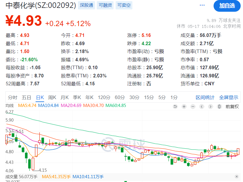 上周末,中泰化学公告,公司及相关责任人收到中国证券监督管理委员会新疆监管局(以下简称“新疆证监局”)出具的《行政处罚事先告知书》,公司股票自2024年5月21日起被实施“其他风险警示”,公司股票自2024年5月20日开市起停牌1天,自2024年5月21日开市起复牌;股票简称由“中泰化学”变更为“ST中泰”。新疆证监局表示,经查明,中泰化学2022年年报中存在虚假记载;未及时披露控股股东及其关联方非经营性资金占用的关联交易,2021年年报、2022年年报中存在重大遗漏;案涉公司债券及债务融资工具存续期披露的年报存在虚假记载、重大遗漏,相关债券募集说明书信息披露不准确。具体来说,为完成控股股东新疆中泰(集团)有限责任公司下达的营业收入目标,中泰化学及其控制的多家子公司,通过将不具有控制权或实为代理人的业务按照总额法核算,2022年合计虚增收入42.48亿元、虚增成本42.48亿元,分别占《2022年年度报告》中披露的营业总收入及营业总成本的7.60%及7.75%。此外,中泰化学未在2021年、2022年定期报告及临时公告中披露控股股东及其关联方非经营性资金占用的关联交易。2021年、2022年,中泰化学及其子公司以预付款、退货款、代收代付运费等名义,直接或通过第三方公司与控股股东中泰集团及其关联方发生非经营性资金占用的关联交易,总发生额为77亿元。截至目前,上述年度资金占用本金已归还。而中泰化学上述虚增收入、虚增成本及未披露控股股东及其关联方非经营性资金占用的关联交易等行为,分别导致多只债券及债务融资工具存续期披露的年报募集说明书所引用的相关财务报告数据不准确及债券存续期年度报告存在虚假记载、重大遗漏。新疆证监局决定对公司责令改正,给予警告,并处以500万元罚款;对相关当事人给予警告并处以数额不等的罚款。中泰化学控股股东为中泰集团,实际控制人为新疆国资委。监管指出,中泰集团作为中泰化学控股股东,组织、指使了对中泰化学的资金占用行为,导致上市公司存在重大遗漏的信息披露违法行为。最新数据显示,中泰化学市值超100亿元,股东户数超11万户。