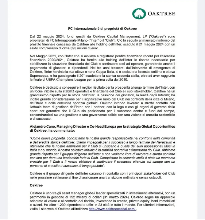 5月22日,橡树资本公告,由于张康阳未能按时偿还为期3年、总额3.95亿欧元的债务,由其所有的国际米兰足球俱乐部(下称国际米兰)正式易主。