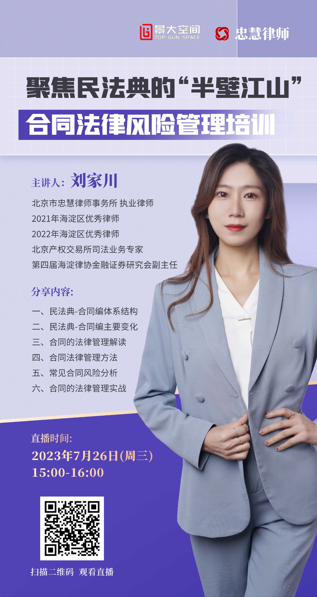 2023年7月26日(星期三)下午3-4点,景大空间孵化器、忠慧律师事务所联合举办聚焦民法典的“半壁江山”合同法律风险管理线上培训会!