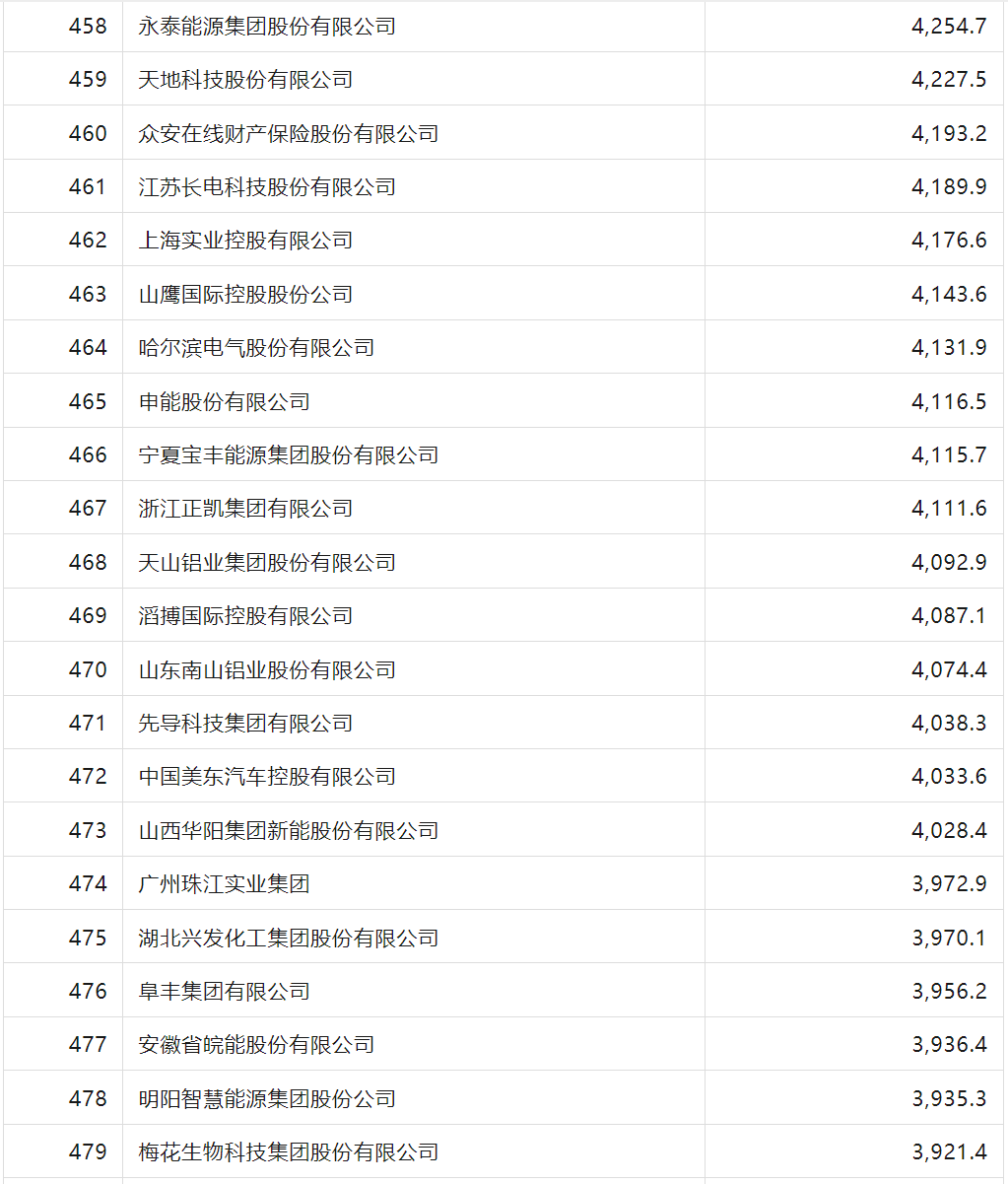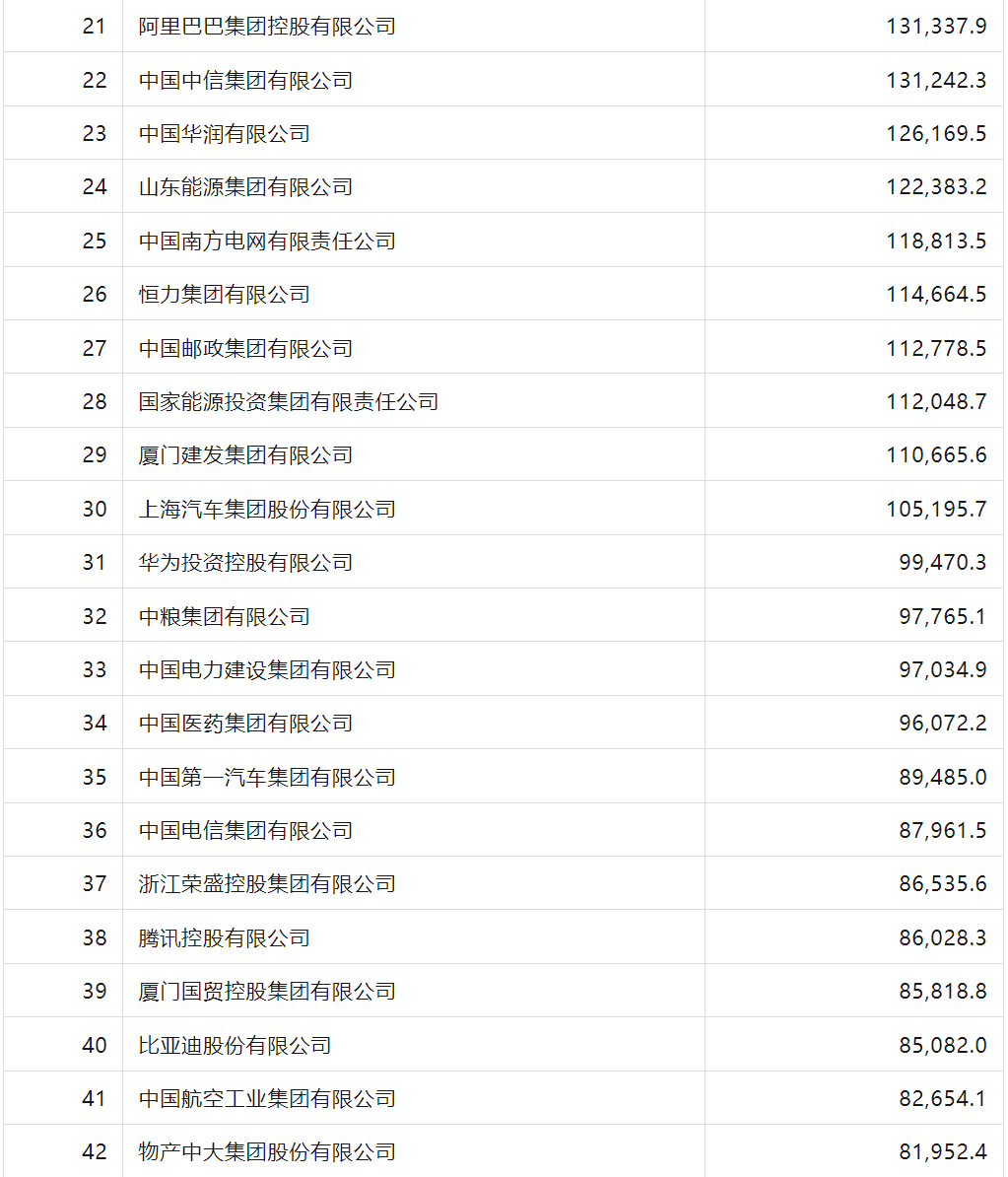 国家电网有限公司以5,459亿美元的营收位居榜首,中国石化和中国石油分列榜单第二位和第三位,位列第四位的是中国建筑集团。中国工商银行位列第五,排名较去年上升1位。苹果最大代工企业鸿海精密位列第七,较去年下降2位,仍是排名最高的台湾地区公司。由于中国平安保险(集团)股份有限公司较去年下降5位至第14位,今年前十位中没有大陆民营企业。而位列第13位的京东集团则成为排位最高的大陆民营企业。
