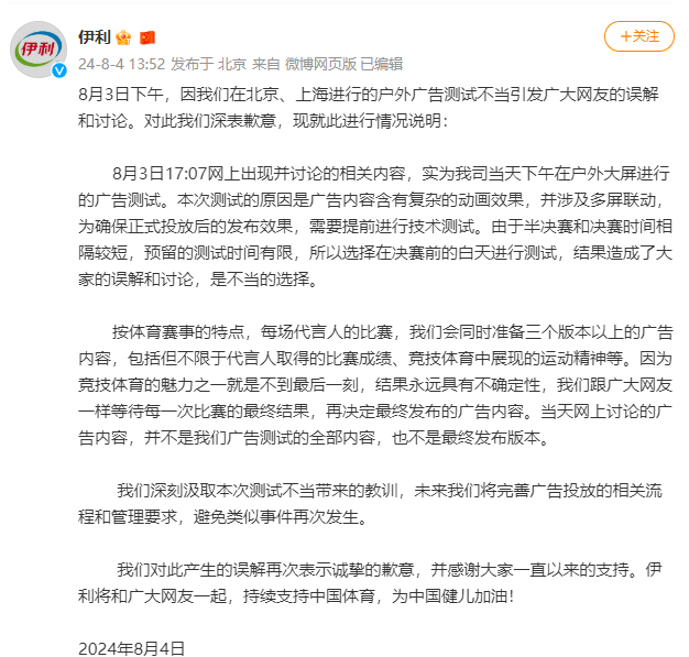 当天,伊利在社交平台上发布道歉公告称,当天为确保比赛后能够第一时间与大家分享喜悦,故提前测试大屏投放效果,导致物料不合时宜露出,给大家带来了不良体验。已立即采取有效措施,确保类似问题不再发生。来源 / @微博管理员、观察者网、鲁中晨报、华商报、@伊利