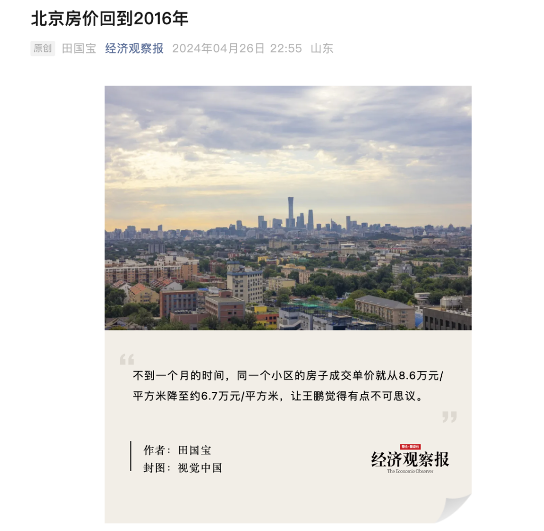 今年我看到不少北京本地媒体都打出北京二手房跌到2016年的标题,甚至不乏经济观察报这些官媒。