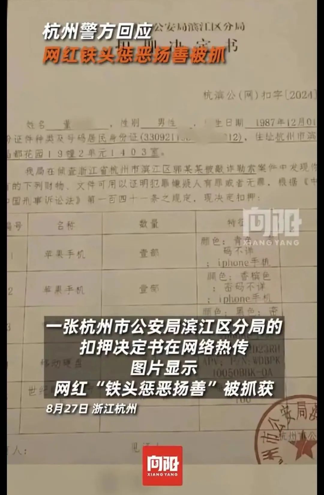 近日,一张杭州市公安局滨江区分局的扣押决定书在网络热传,图片显示,网红“铁头惩恶扬善”(原名董某明,下称“铁头”)被抓获。8月27日,据阳光报向阳视频,杭州市公安局滨江分局工作人员表示,铁头已被抓,具体涉案内容相关部门正在处理。