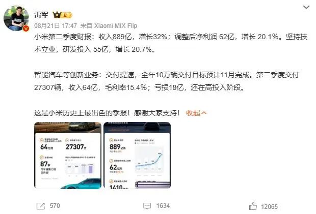 天眼查App显示,近日,北京雷石天地电子技术有限公司发生工商变更,雷军、启迪银杏创业投资管理(北京)有限公司退出股东行列,新增北京君利联合创业投资合伙企业(有限合伙)为股东。公开信息显示,该公司是一站式K歌解决方案提供商,创始人王川也是小米集团联合创始人。据公开资料,特斯拉、比亚迪、理想、东风、吉利等超过90%的造车新势力此前都相继宣布上线雷石系统,车载KTV已经逐渐成为汽车标配。8月21日,小米集团首次披露汽车业务季度成绩单。智能电动汽车等创新业务净亏损18亿元,以此推算,小米汽车单车亏损超6万。21日深夜,小米集团创始人、董事长雷军在微博发文回应:“造车很苦,但成功一定很酷!小米汽车还在投入期,希望大家理解。”在谈及上述热搜时,他进一步表示,“我觉得这个算得既对也不对,因为小米汽车还在投入期,刚刚开始,我觉得我们的财务表现还是不错的,的的确确在第二季度,我们在智能汽车等创新业务上亏了18个亿,换句话说投入了18个亿,但等我们到了一定的规模,我相信很容易打平的,所以大家不用替我们焦虑。”小米集团总裁卢伟冰在业绩会表示,小米汽车SU7亏损的原因在于:第一,目前小米汽车的规模较小,而汽车是一个典型的规模经济的行业,未来有信心做大汽车的规模;第二,小米第一辆车是纯电轿车,其投入成本本身就比较高,消化这部分成本还是需要一定的时间。小米集团披露2024年上半年及二季度业绩,第二季度营收888.9亿元,同比增长32%,创历史新高;调整后净利61.8亿元,同比增长20.1%。业务分部来看,智能电动汽车等创新业务分部,收入为人民币64亿元,经调整净亏损18亿元,交付27307辆,毛利率15.4%。雷军表示,“智能汽车等创新业务亏损18亿,还在高投入阶段。这是小米历史上最出色的季报!感谢大家支持!”截至8月29日收盘,小米集团-W(1810.HK)报18.88港元/股。在交出了历史上最出色的季报后,小米还官宣了要实施大手笔的股权激励计划。8月22日晚间,小米集团-W(1810.HK)发布公告称,董事会宣布,公司于8月22日根据2023年股份计划奖励合共4101.9万股奖励股份予1510名选定参与者,包括本集团雇员及服务供应商。奖励股份于授出日期之收市价为每股19.1港元。据此计算,本轮激励股权价值约7.835亿港元,约合人民币7.17亿元,人均约47.48万元人民币。据南财快讯统计,这是2024年以来小米第三次股份奖励,累计授出2.28亿股,按公告授出日期之收市价计算,约合36.22亿港元,约合人民币33.17亿元。
