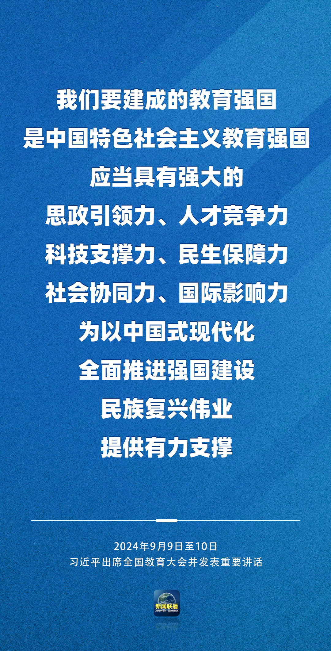 习近平强调,我们要建成的教育强国,是中国特色社会主义教育强国,应当具有强大的思政引领力、人才竞争力、科技支撑力、民生保障力、社会协同力、国际影响力,为以中国式现代化全面推进强国建设、民族复兴伟业提供有力支撑。