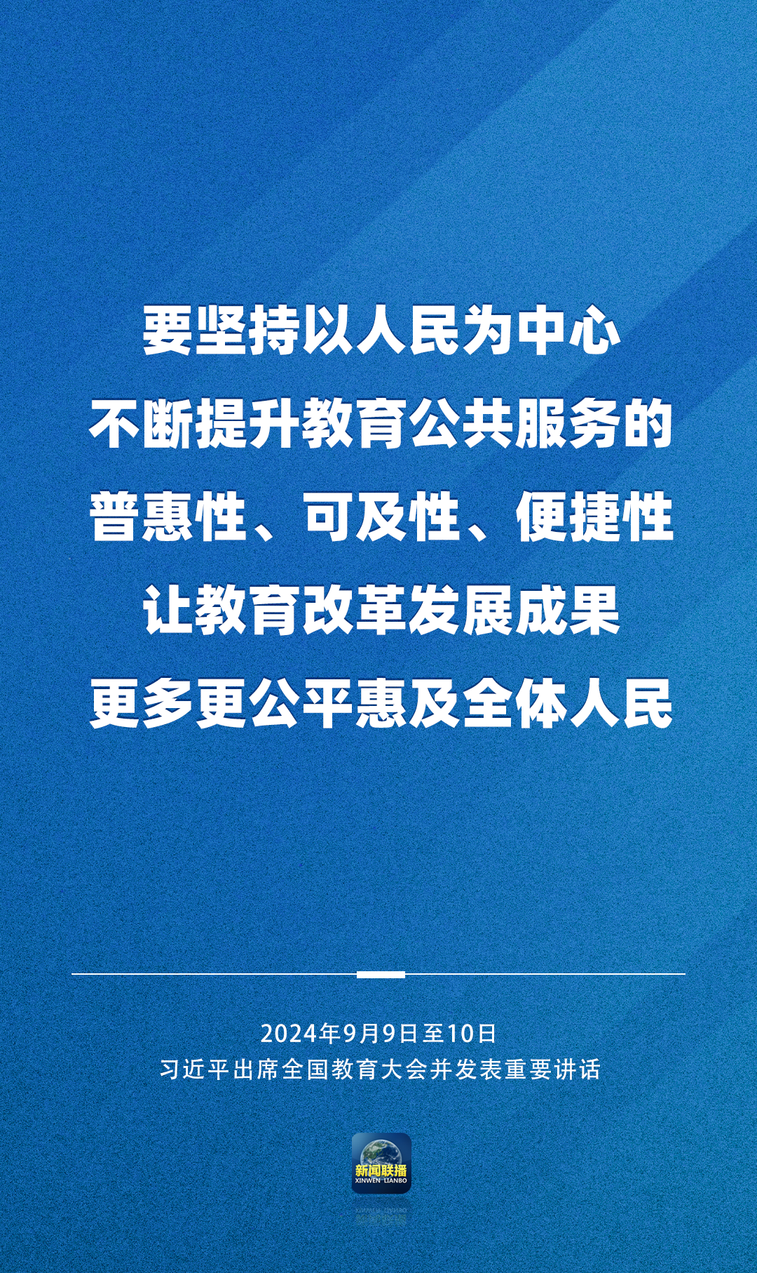 习近平强调,要坚持以人民为中心,不断提升教育公共服务的普惠性、可及性、便捷性,让教育改革发展成果更多更公平惠及全体人民。优化区域教育资源配置,推动义务教育优质均衡发展,逐步缩小城乡、区域、校际、群体差距。持续巩固“双减”成果,全面提升课堂教学水平,提高课后服务质量。深入实施国家教育数字化战略,扩大优质教育资源受益面,提升终身学习公共服务水平。