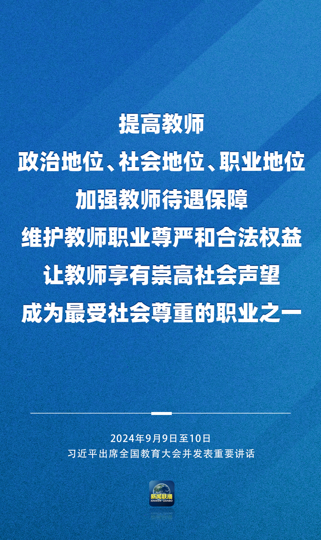 习近平指出,要实施教育家精神铸魂强师行动,加强师德师风建设,提高教师培养培训质量,培养造就新时代高水平教师队伍。提高教师政治地位、社会地位、职业地位,加强教师待遇保障,维护教师职业尊严和合法权益,让教师享有崇高社会声望、成为最受社会尊重的职业之一。
