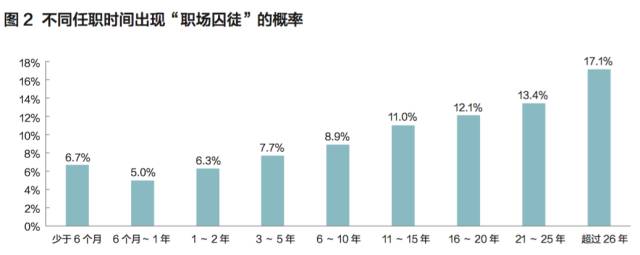 从行业属性来看,“职场囚徒”在几乎所有的行业都有分布,没有体现出偏重于某些特定行业的现象。从人口统计因素上看,“职场囚徒”最典型的特征体现在任期上,任职时间较长的员工比任职时间较短的员工更可能变成“囚徒”。值得注意的是,成为“囚徒”主要与任职时间相关,与性别、种族或年龄等其他人口统计因素几乎没有关系。