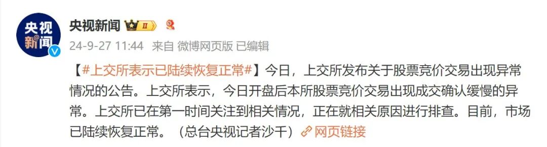此前,有东方财富交易软件的用户向新华财经反映,手中部分股票如汇顶科技无法交易,撤单也不行。另据媒体报道,有券商已向分支机构通报,即“经公司技术监控发现,目前报单有延迟。各家券商均有反馈,属于行业共性问题”。有业内人士分析,目前市场委托量非常大,客户的撤单委托可能无法及时收到撤单成功或失败的明确结果,属于正常现象。9月27日中午,上海证券交易所发布《关于股票竞价交易出现异常情况的公告》。上交所表示,今日开盘后本所股票竞价交易出现成交确认缓慢的异常。上交所已在第一时间关注到相关情况,正在就相关原因进行排查。一位资深市场人士分析指出,这可能是订单拥挤引发“塞单”,在历史上,其他交易所也发生类似的交易异常。具体表现是订单回报出现延迟,交易者长时间不清楚已报委托的状态。交易者不断撤单并重新申报,导致券商到交易所的流量迅速激增并积压。不过,投资者无需担心。在系统疏通后,交易所会对此发布公告,期间的撮合成交均会正常处理。来源 / 辽沈晚报、上交所、新华财经、央视新闻客户端、南方+