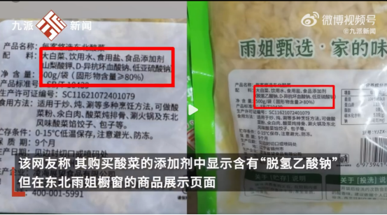 直播间购买的酸菜中添加了“脱氧乙酸钠”,而这一成分在“东北雨姐”橱窗的商品展示页面上并未被标注。