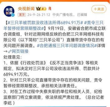 接下来,三只羊集团公司将罚款6894.91万元,暂停经营并限期整改。抖音平台则宣布,9月21日起已对三只羊旗下账号进行停播处理。