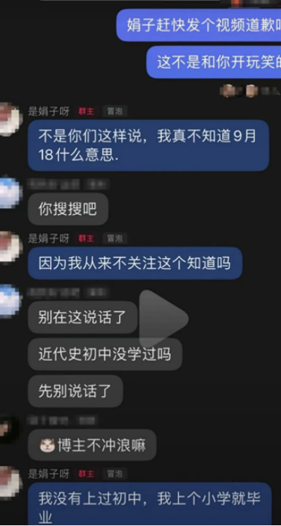 在网友的持续质问中,“娟子”却在线回怼网友称,自己“没有上过学”“没有念过书”“不看新闻”“没听说过‘9·18’”,说完还掩嘴大笑。