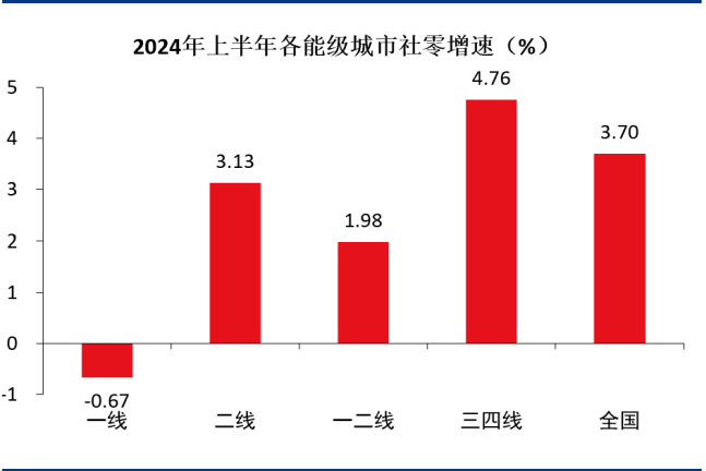 今年上半年,在北上广各地的太古系商业销售额增速均在下降。其中,北京三里屯太古里零售增速为-3.5%、成都太古里增速为-17.2%,上海兴业太古汇增速为-19.6%……武汉恒隆广场的LV销售额下降15%。7月底,该商场的LV门店还来一场全场8.3折的大促销;高傲的爱马仕甚至都不用配货了,即使是热门款配货比也跌到了1:1.5;原本月入三四万的柜哥柜姐们,现在月入过万都够呛。有的拿着到手只有几百块的工资条,已准备跳槽了……2024年上半年,北京限额以上餐饮企业营收为492.1亿元,同比下降2.9%。同时利润总额为1.8亿元,同比暴跌88.8%,利润率低至0.37%。今年上半年,上海限额以上住宿和餐饮企业还亏了7.7亿。看完下降的,咱们再来看看一二线哪些消费数据在增长。2024年上半年,一线城市总社零增速为负,整合一二线城市也仅仅达到1.98%的水平。2024年上半年,三四线城市总体社零增速为4.76%。硬是靠着三四线城市的消费力,才把全国社零增速拉到了3.7%的水平。