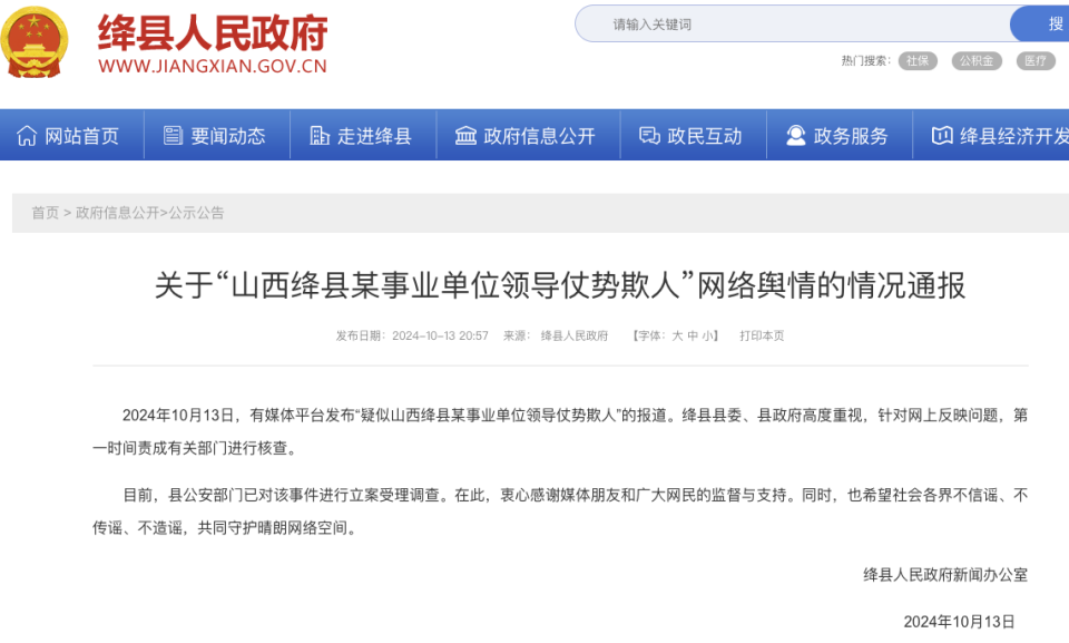 山西省运城市绛县人民政府新闻办公室10月13日晚发布情况通报:10月13日,有媒体平台发布“疑似山西绛县某事业单位领导仗势欺人”的报道。绛县县委、县政府高度重视,针对网上反映问题,第一时间责成有关部门进行核查。目前,县公安部门已对该事件进行立案受理调查。10月13日,有网友爆料称,安徽省蚌埠市龙腾路附近发生一起交通事故,造成多人伤亡。网传视频显示,在一个十字路口附近,停有一辆120急救车,现场有多名医护人员正在救助,一名伤员被抬上担架。不远处,有一名身着特警制服的工作人员正在与路人交流。10月13日深夜,安徽省蚌埠市公安局交通警察支队发布警情通报: